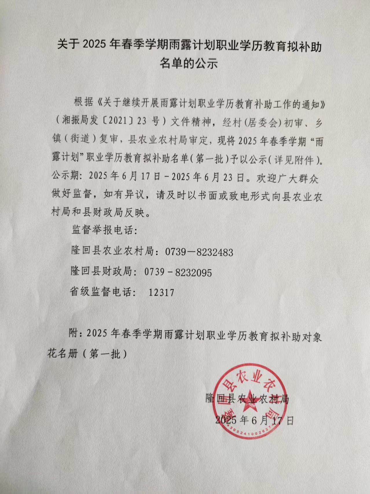 关于2025年春季学期雨露计划职业学历教育拟补助名单的公示