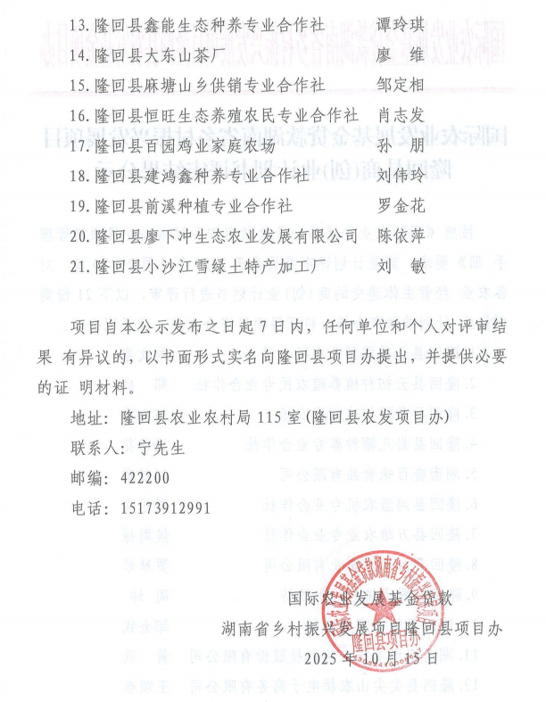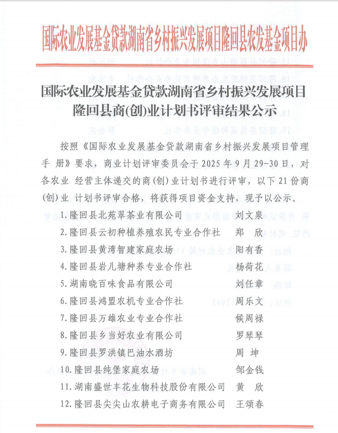 国际农业发展基金贷款湖南省乡村振兴发展项目隆回县商(创)业计划书评审结果公示