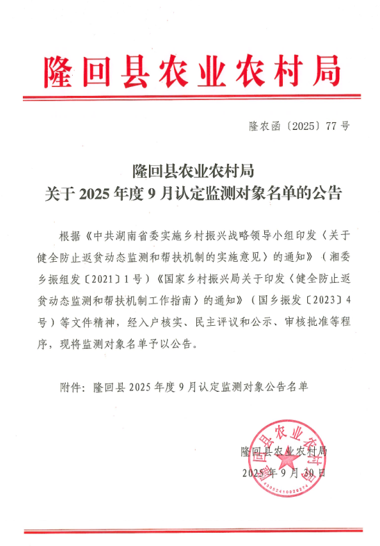 隆回县2025年度9月认定监测对象公告名单