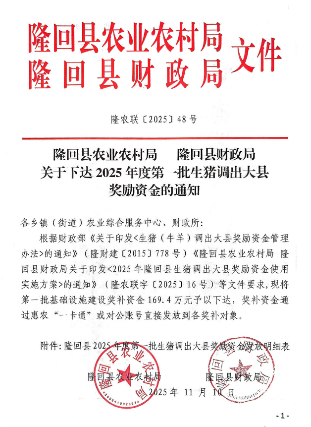 关于下达2025年度第一批生猪调出大县奖励资金的通知
