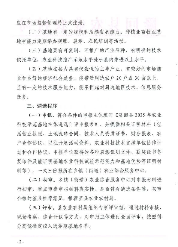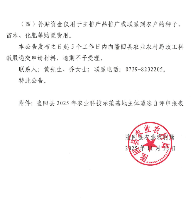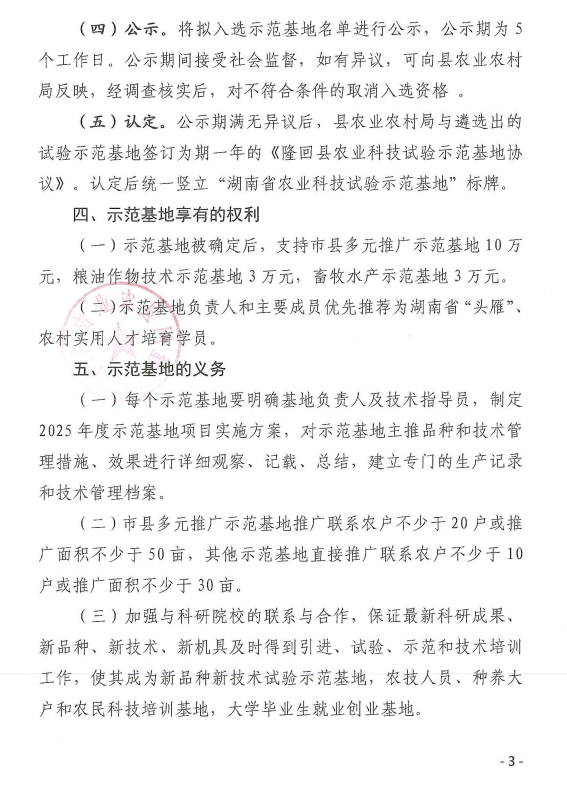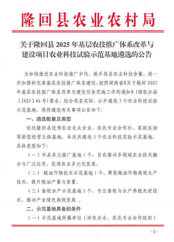 关于隆回县2025年基层农技推广体系改革与建设项目农业科技试验示范基地遴选的公告