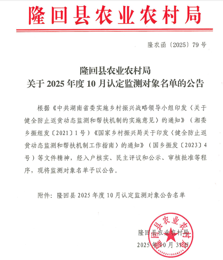 隆回县2025年度10月认定监测对象公告名单