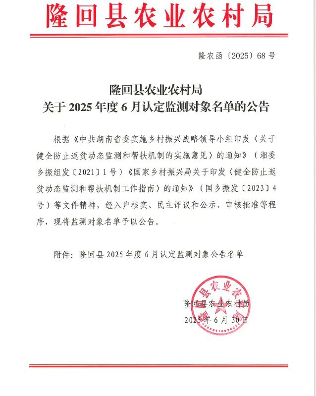 隆回县农业农村局关于2025年度6月认定监测对象名单的公告
