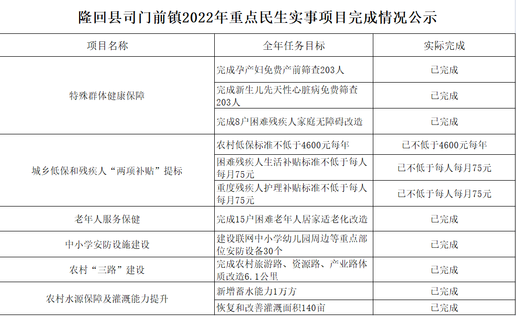根据隆统字〔2023〕1号文件要求,现对我镇2022年度重点民生实事完成情况公示如下: