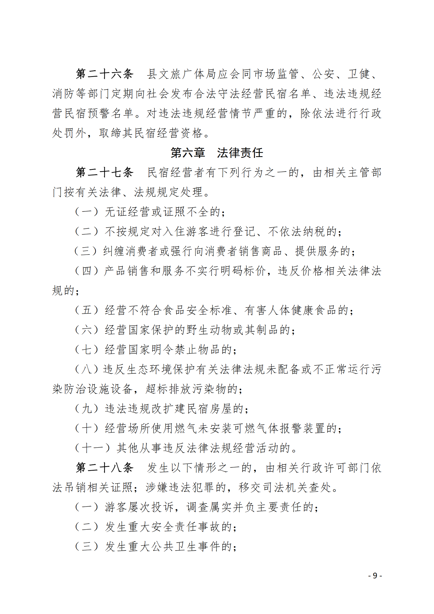 第二十六条 县文旅广体局应会同市场监管、公安、卫健、消防等部门定期向社会发布合法守法经营民宿名单、违法违规经 营民宿预警名单。对违法违规经营情节严重的,除依法进行行政 处罚外,取缔其民宿经营资格。
