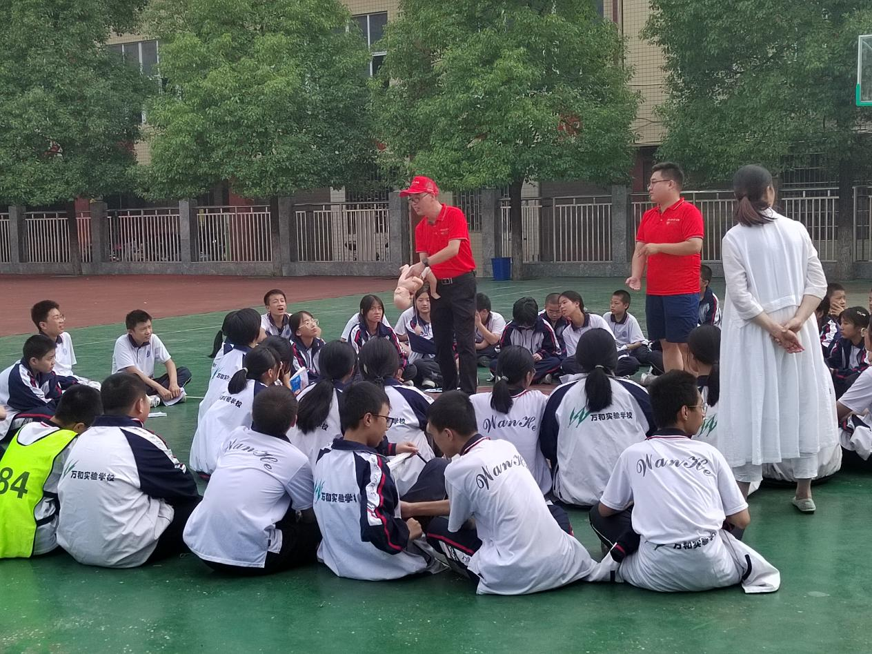 在万和学校的操场,12个班级整齐有序地分组坐成圆圈,认真聆听急救科普知识讲座。来自隆回县人民医院“蜜蜂团队”志愿者呈咏雄等用人体模型进行了海姆立克、心肺复苏等急救知识的操作演练。