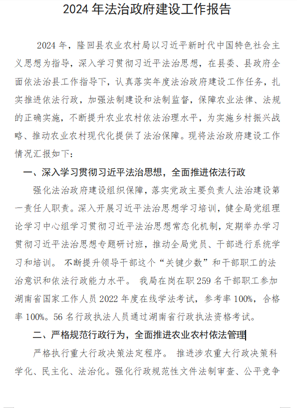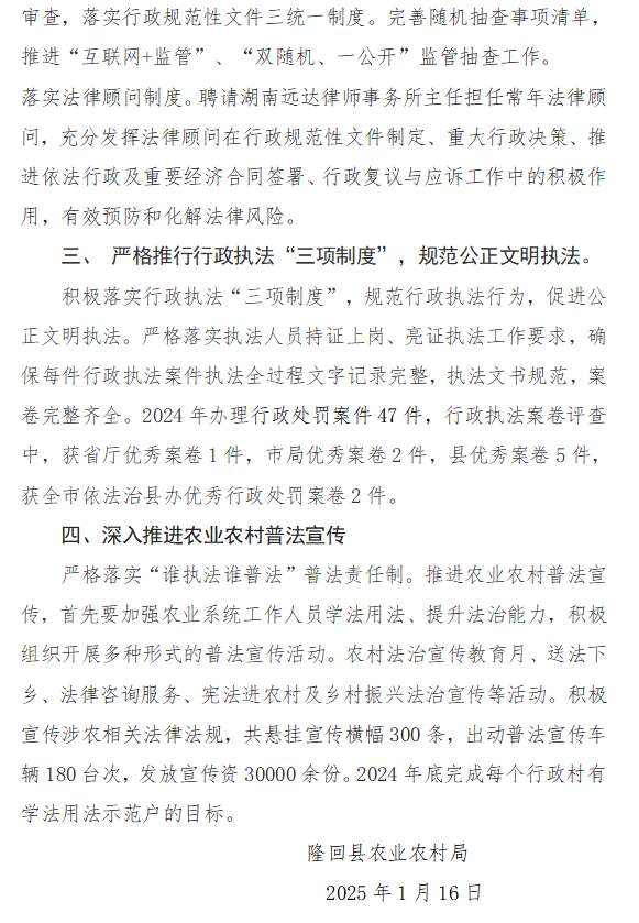 隆回县农业农村局2024年法治政府建设工作报告