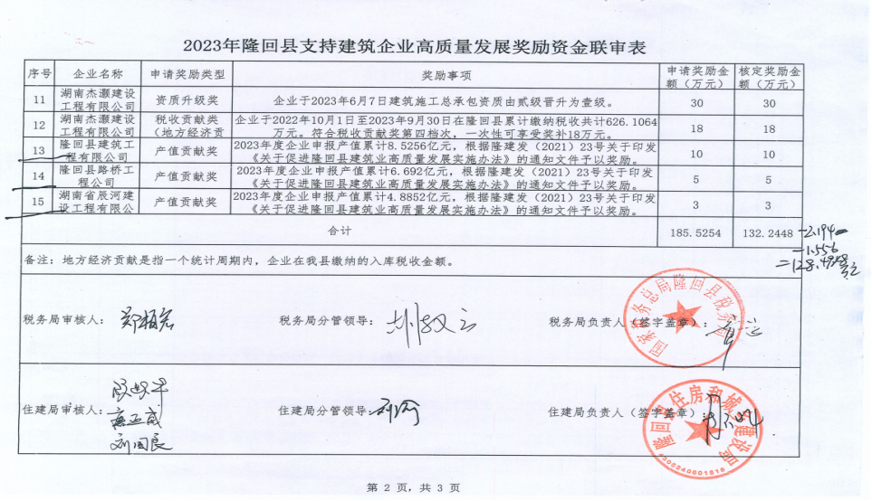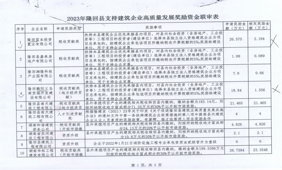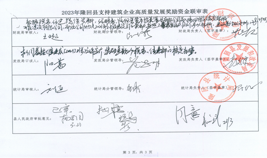 2023年隆回县支持建筑企业质量发展奖励资金联审表