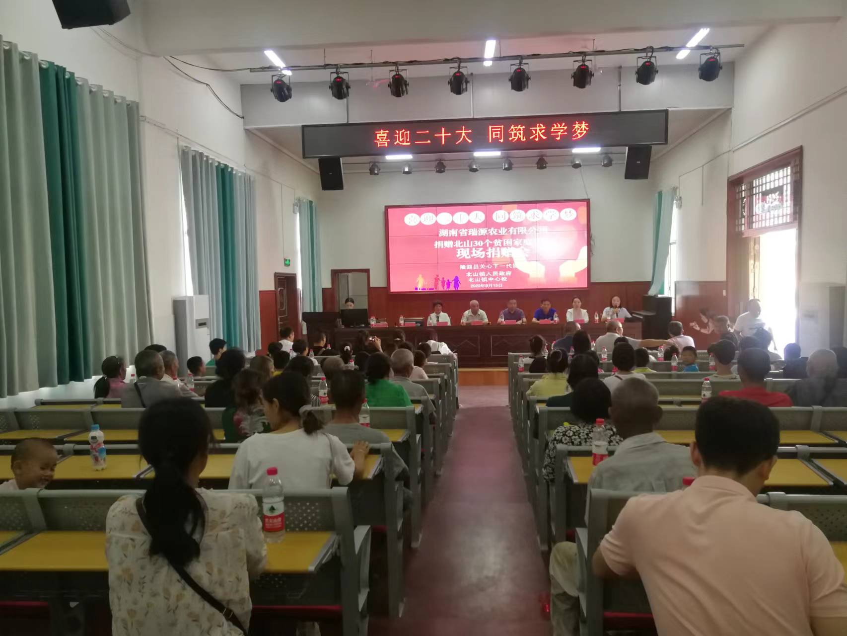 9月15日上午,湖南省瑞源农业有限公司董事长文爱华为贫困学子献爱心之捐赠仪式在隆回县北山中学多媒体室举行,出席此次仪式的有县关工委主任刘文成、北山乡党委书记王熙华、北山中心校校长曾旭平、北山中学校长姚飞勇等领导及30名授赠学生和家长。