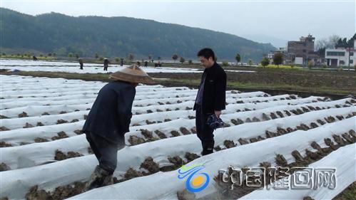 镇长刘咏波(右)在烟田指导烟农盖膜