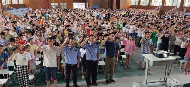 “……遵守禁毒法规、学习禁毒知识,坚决遏制毒品诱惑……”在1100余人铿锵有力的禁毒宣誓声中,7月2日,六都寨镇中学为该校师生准备了离校前一课——“青春有约定,禁毒我先行”禁毒教育活动。