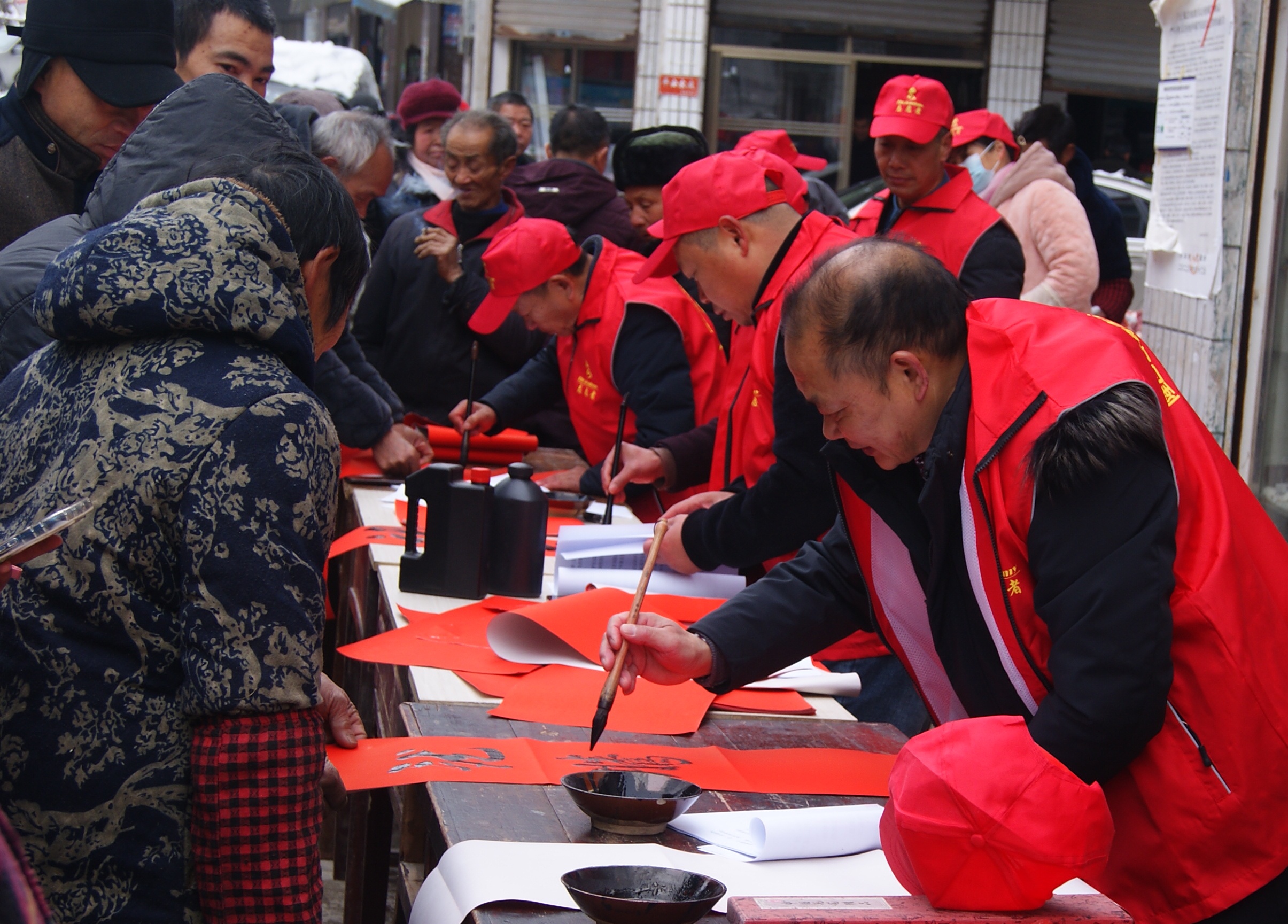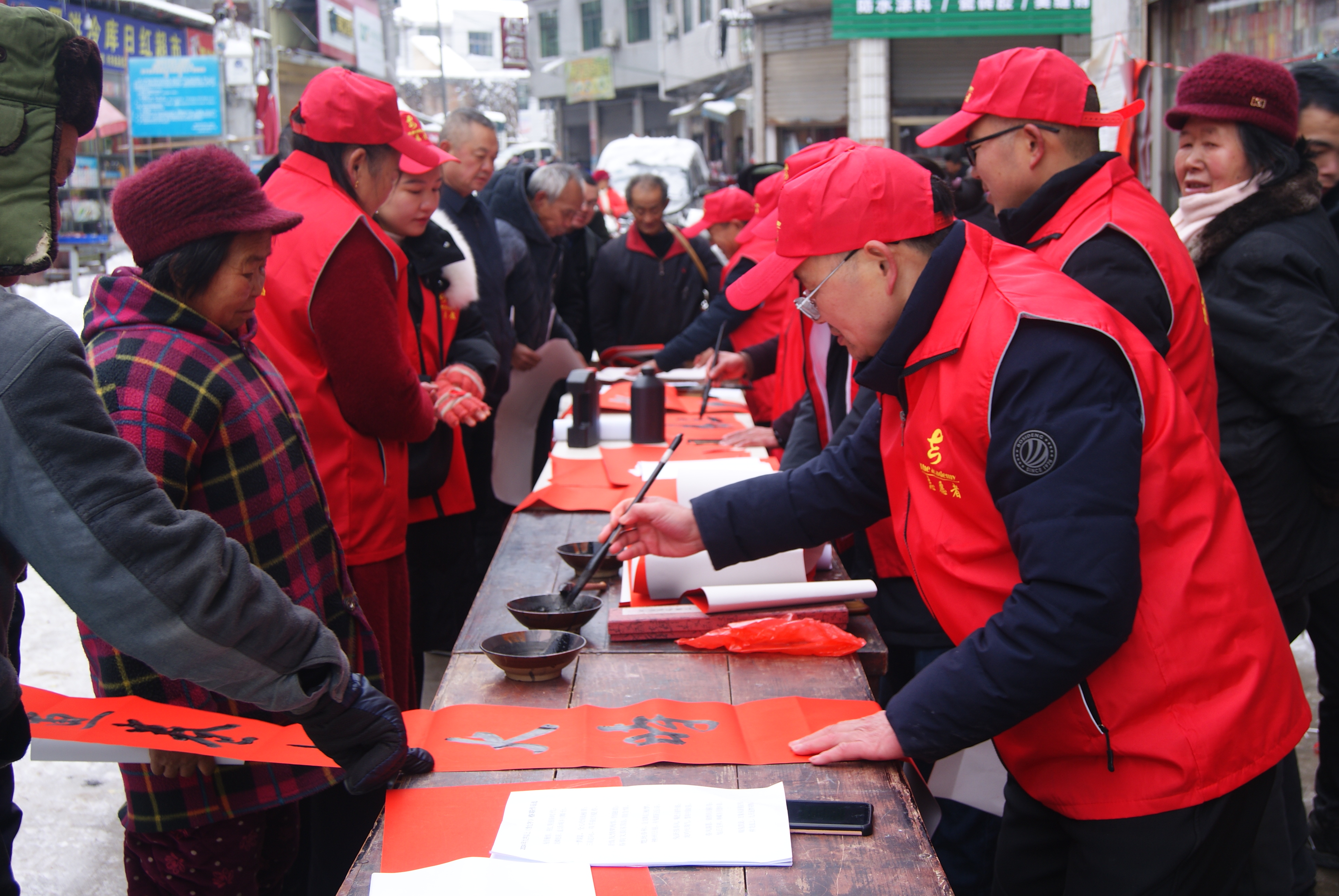 隆回县诗联学会会长黎祜银、隆回县诗联学会副秘书长兼县书法家协会理事谭水松等20余名县镇会员现场撰写的200余副春联,联墨双辉,备受乡亲们喜爱,不到两个小时,就被争先恐后领走。由于大雪封山,交通中断,纸张告罄,到后来还有许多从四面高山上踏雪下来的乡亲没有领到春联。为了满足乡亲们的愿望,让中华优秀传统文化走进千家万户,走进乡亲们的心里,袁吉六文化教育研究院临时商议决定:再联系纸厂,快递发货,等到下一个赶集日(1月29日)再送春联。