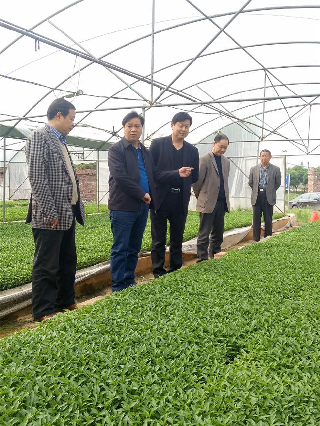 图为副县长奉锡样(左二)在军杰食品科技有限公司育苗基地调研