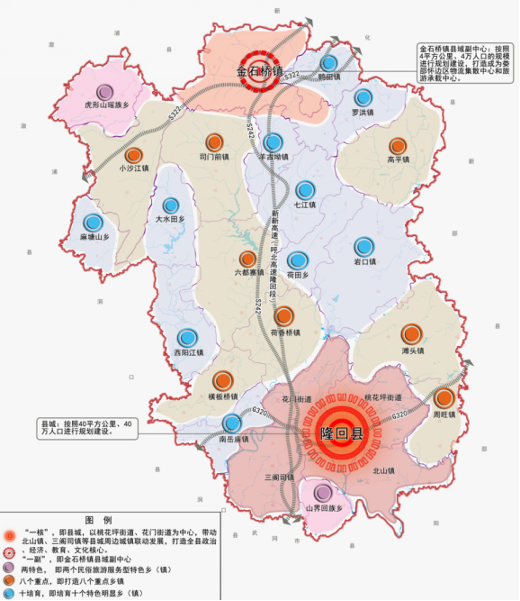 5.城乡面貌持续改善。新型城镇化建设有序推进,城乡统筹发展步伐明显加快,城镇化率由2015年的31.34%上升至2020年的45%。中心城区品质持续提升。隆回大道、魏源大道建成通车,环城西路南段、伏龙江路北段、环城北路站前段、龙门路等一批城市道路拉通,城区路网结构不断升级优化。桃洪中路平战结合人防工程顺利推进。县城新自来水厂建成并投入使用,城区垃圾治理、污水治理深入推进,垃圾无害化处理率达100%、污水处理率达98%。县城区排水管网改造基本完成,“城市看海”问题有效缓解。老旧城区改造加快推进,完成8195户棚改任务。控建拆违有力有效,城区违法建设实现零容忍。生产生活条件明显改善。道路基础设施建设全面提速,怀邵衡铁路全线通车,隆回正式迈入高铁时代。沪昆高速周旺、隆回出口扩改工程竣工,呼北高速完成前期工作,隆武公路、白水公路、崇山公路、崇文公路等建成通车,大花至善缘亭、金石桥至高洲温泉公路、丁洞公路等开工建设,G320过境线、周滩公路基本完工,国省干线公路总长584.4公里、县道总长343公里、乡村公路总里程达6644公里,“三纵三横三连”的干线公路骨架全面形成,道路通畅率达100%。完成中小河流治理、高效节水灌溉、农村集中供水工程等项目477个,农村饮水安全覆盖率100%。“气化邵阳”隆回支线项目扎实推进,完成六都寨等7个乡镇燃气管网建设。电力基础设施不断完善,110千伏城东变开工建设,隆六II线、35千伏西山变等供配电项目全面完成,累计完成38条10千伏线路提质改造,中心村和贫困村电网升级改造全面完成。积极推进“智慧隆回”建设,所有行政村(社区)全部通4G移动信号和光纤宽带,光纤宽带用户15.7万户,数字电视用户4.5万户,建成5G基站100个,通信基础设施建设暨创建5G示范县工作全面启动。农村人居环境整治扎实有效,推行市场化运作保洁模式,生活垃圾集中处理实现全覆盖,成功创建省级卫生县城、市级文明县城。金石桥、滩头、北山等5个乡镇污水处理设施投入运行,农村地区污水处理能力明显提升,农村污水处理示范县创建工作位居全省第一。