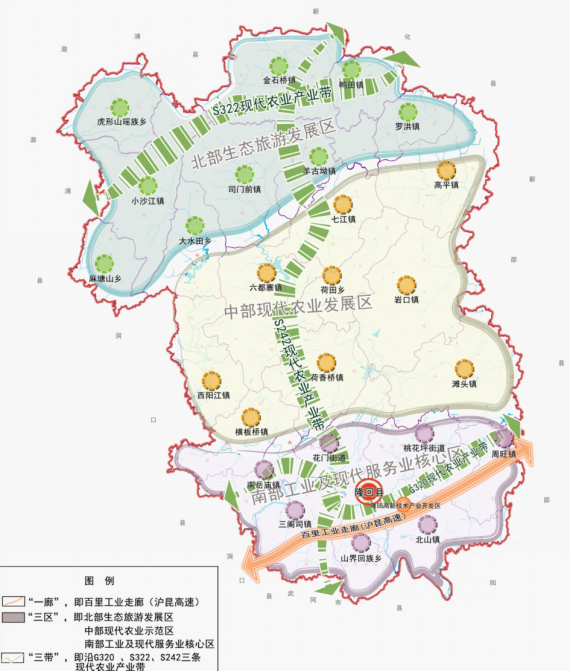 2.产业发展提质增效。产业结构不断优化。三次产业结构比由2015年的23.7:28.1:48.2调整为2020年的21.5:25.63:52.87,第一、二产业比重逐步下降,第三产业比重上升4.67个百分点,现代服务业发展势头强劲,三次产业结构优化迸发活力。现代农业加快发展。金银花、烤烟、优质稻、生猪等四大主导产业不断发展壮大,油茶、三辣、百合、特色果蔬等四大特色产业势头良好,形成了“四主四特”农业产业发展格局。“隆回龙牙百合”“隆回金银花”等农产品成为全省乃至全国都具影响力的知名品牌。农业一二三产业融合发展加快推进,建成金银花、蔬菜、龙牙百合、辣椒、烤烟示范基地20个,培育形成国家级农业产业化龙头企业1家、省级农业产业化龙头企业4家、市级农业产业化龙头企业41家,建成省级现代农业特色产业园4个,农民专业合作社837家,农产品加工企业实现销售收入34.5亿元。金银花获批全省“一县一特”项目,小沙江镇被评为省级培育型特色小镇。先后获得国家粮食生产先进县、农产品加工特色县、农村一二三产业融合试点县、国家农产品质量安全县等荣誉。现代工业稳步发展。全县工业发展来势较好,传统产业提质升级,新型工业崛起壮大,平台载体更加完善。规模工业增加值由2015年的32.5亿元上升至2020年的46.3亿元、年均增长7.4%,累计新增规模工业企业70家,规模以上工业企业182家,被评为全市产业发展和项目建设工作先进县。农副产品及食品加工、轻工制造、造纸、建材等传统产业稳步壮大,南方水泥、湘丰特纸、祥佳胶带、三百运动、和丰信、和亚运动等骨干企业生产经营形势逆势上扬,传统产业不断提质升级。智能制造、新能源装备、新材料等新兴产业蓬勃发展,宏邦精密机械、中力玻璃、鸿盈高科、宝莲风电、维山风电、牛形山风电等一批新兴产业项目陆续投入运营,新兴产业发展规模不断扩大。产业发展平台更加完善,湘南湘西承接产业转移示范区建设、东莞产业园建设加快推进,高新区调区扩园工作稳步推进,园区面积由6平方公里扩展到10平方公里。以隆回高新区为主平台的产业园区不断壮大,园区基本形成轻工制造、电子信息和农产品加工三大主导产业,入园企业达到245家,园区技工贸总收入由2015年的109.9亿元增加到2020年的160余亿元,县高新区获评全省先进园区、全省第一批绿色园区。现代服务业势头强劲。全域旅游持续升温,年接待游客220.32万人次,魏源故居、龙瑶幽谷、大花瑶虎形山景区、向家村成功创建国家3A景区。花瑶景区4A创建有序推进,景区基础设施不断完善,崇山、崇文、白水公路建成投用,完成瑶王古寨门楼改造、花瑶游客接待中心装修,“云上花瑶”列入2019中国美丽乡村休闲旅游精品线路,成功举办湖南省2020年(夏季)乡村文化旅游节。商贸物流发展势头良好,新增限上企业24家,保税物流仓、出口监管物流仓等物流仓储中心即将建成投入使用。电子商务不断发展壮大,农产品电商销售额达3.6亿元。普惠金融示范区创建扎实推进,推动企业上市迈出实质性步伐,鸿利药业等7家企业在省股交所挂牌。